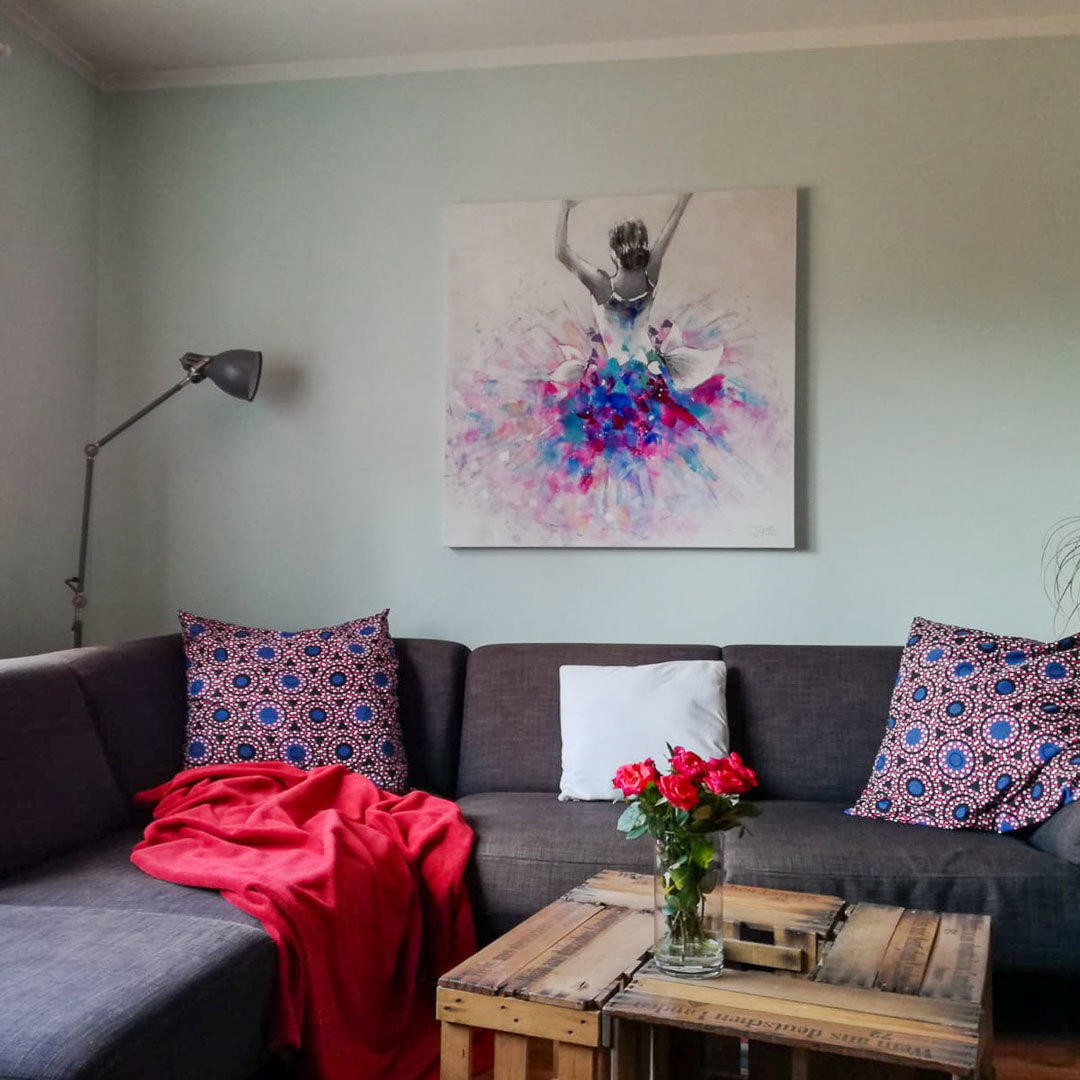 In 'Primaballerina' ist die Szene einer tanzenden Frau eingefangen. Das Tutu der Ballerina schwingt in lila, grauen und blauen Farbtupfern und wirkt, als würde es sich in der Drehbewegung auflösen. Bezaubern Sie Ihre Besucher jedes Mal aufs Neue mit diesem handgemalten Leinwandgemälde in Ihrem Schlafzimmer oder Kinderzimmer. Ihr handgemaltes Gemälde erhalten Sie in der Größe 80x80cm. Anders als bei minderwertigen Drucken auf Leinwand können Sie auf unseren Unikaten jeden Pinselstrich fühlen. 0 1 Ölgemälde Handmade Quality 2 2 0
