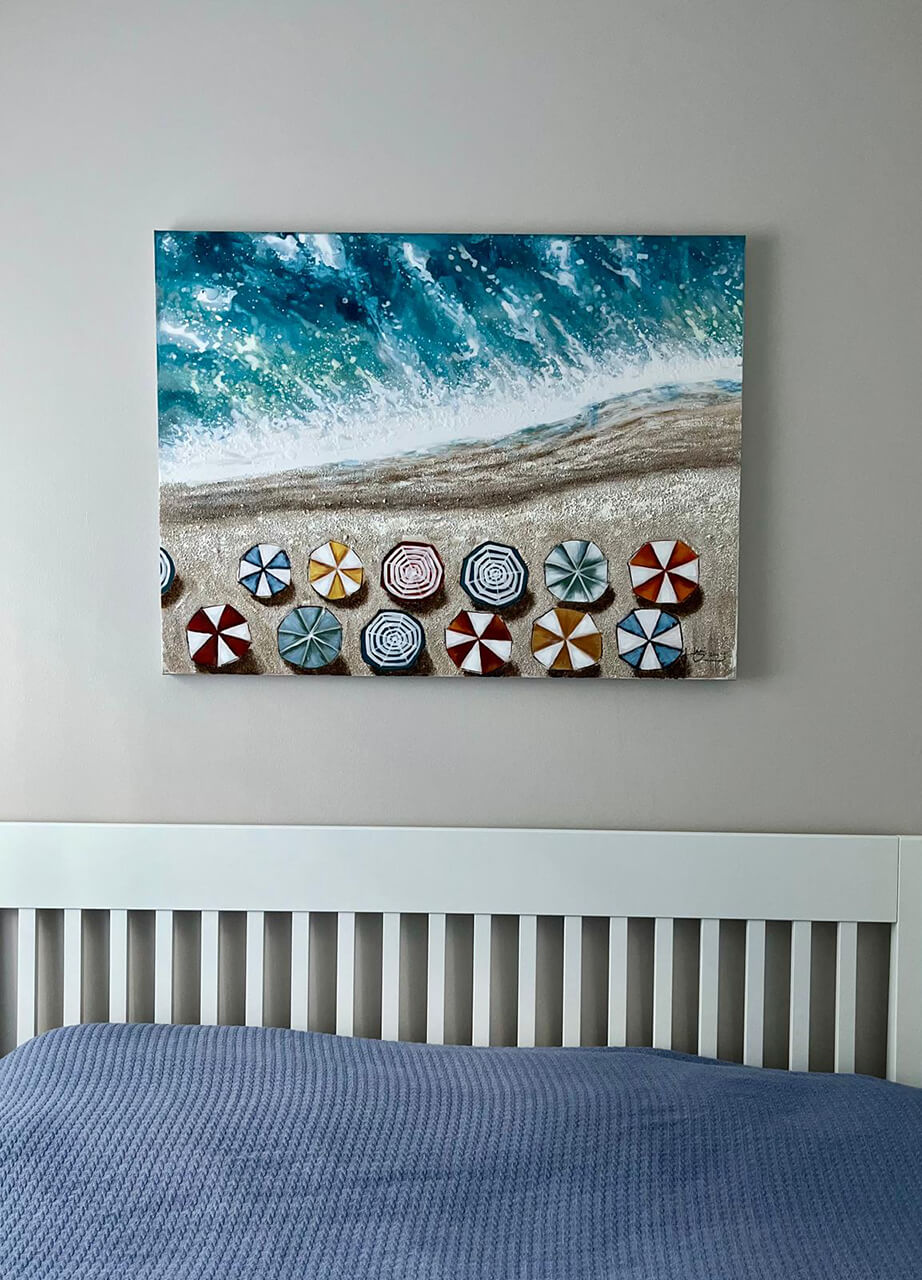 Das Acrylgemälde verspricht einen sonnigen Tag voller 'Erholung am Meer'. Strahlendes Blau mischt sich mit sanftem Beige und wirkt durch die fröhlichen Farbtupfen der Sonnenschirme vervollständigt. Die reliefartige Oberflächenstruktur verleiht dem handgemalten Kunstwerk Tiefe und Intensität. Holen Sie sich pure Urlaubsstimmung in Ihr Wohnzimmer. Ihr handgemaltes Gemälde erhalten Sie in der Größe 100x75cm. Anders als bei minderwertigen Drucken auf Leinwand können Sie auf unseren Unikaten jeden Pinselstrich fühlen. 0 Canvas pictures 1 Acrylgemälde Handmade Quality 2 2 0